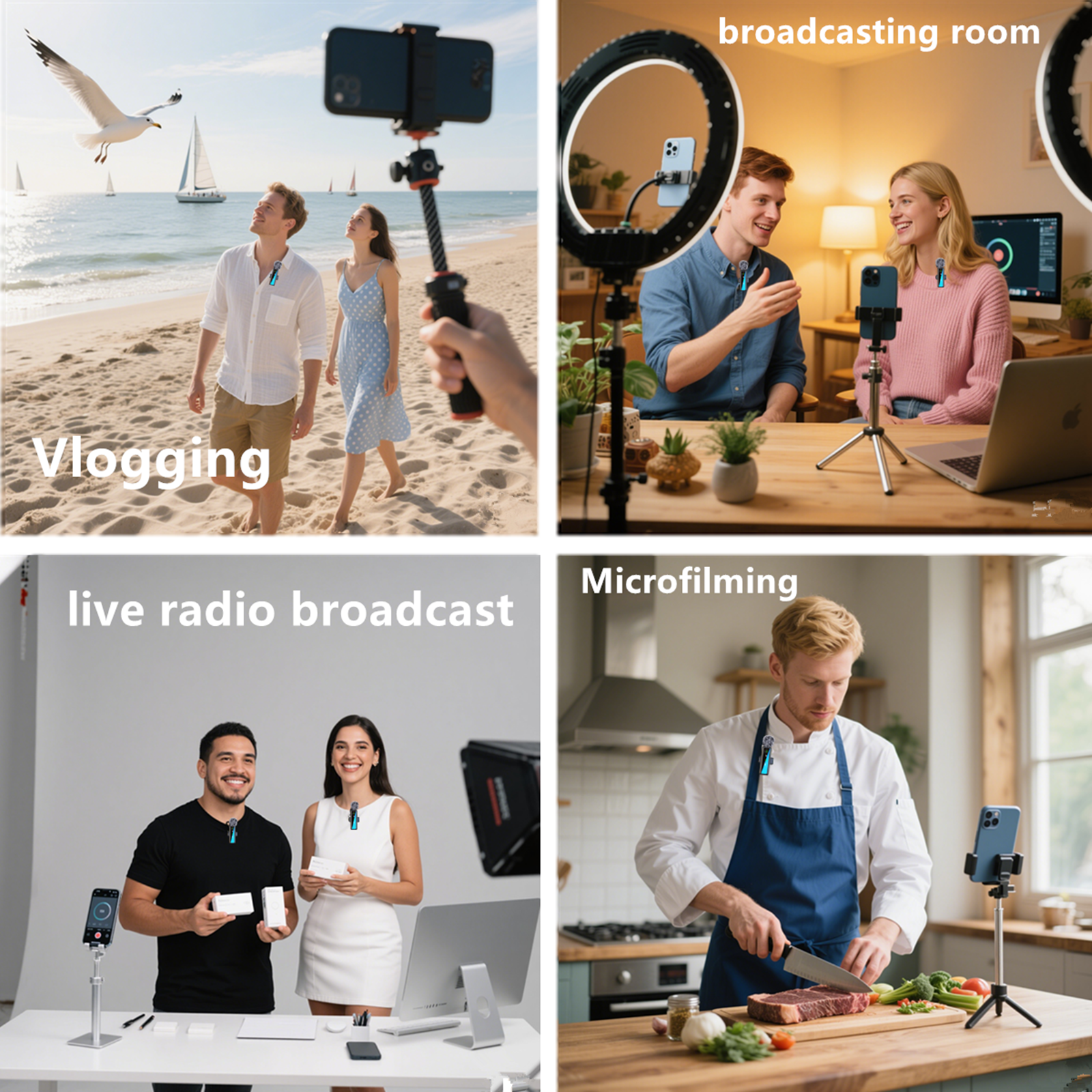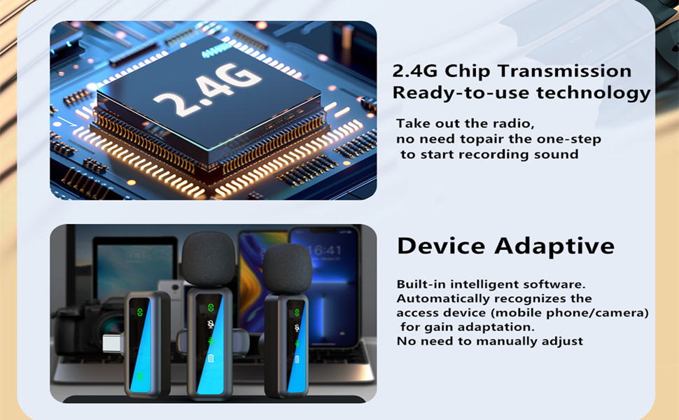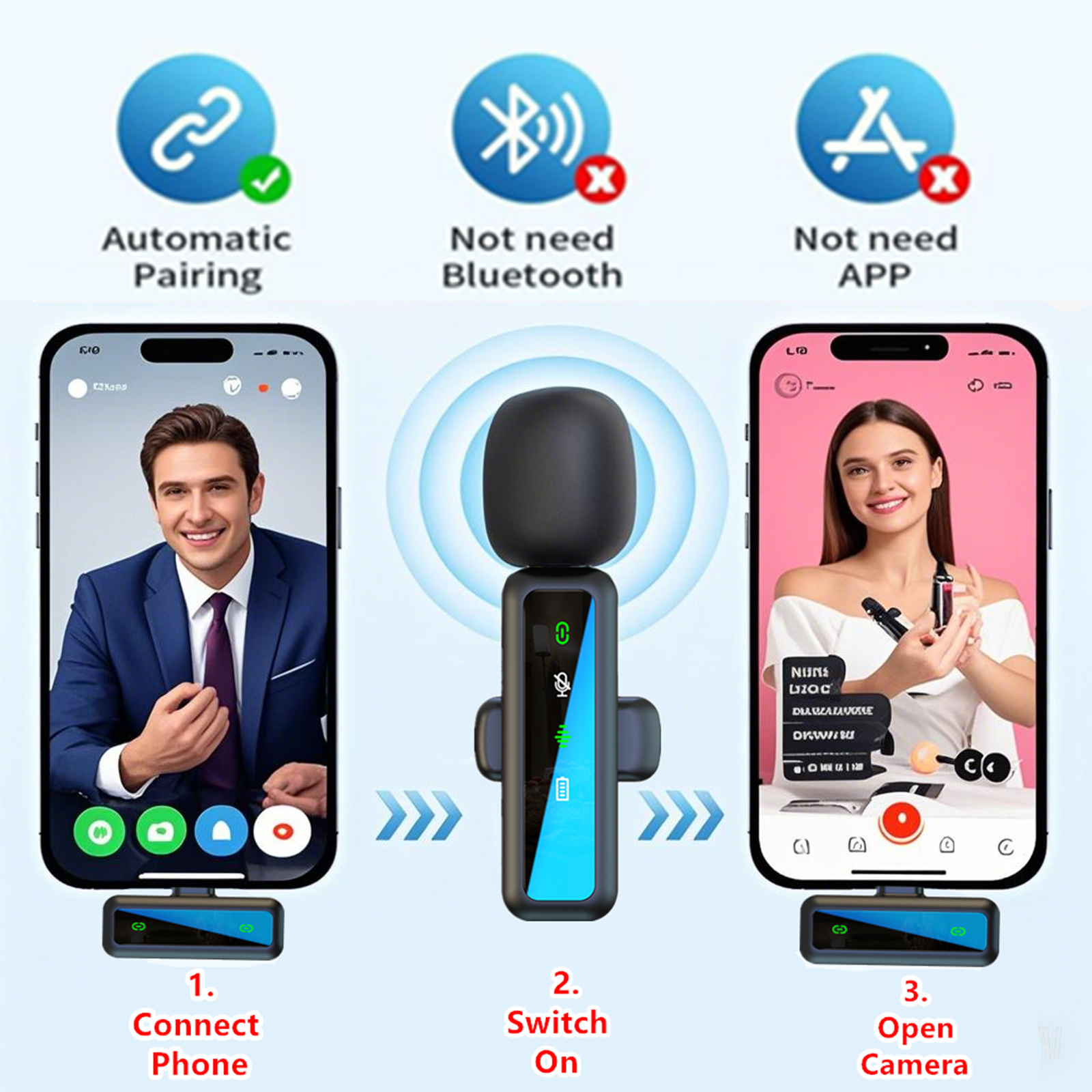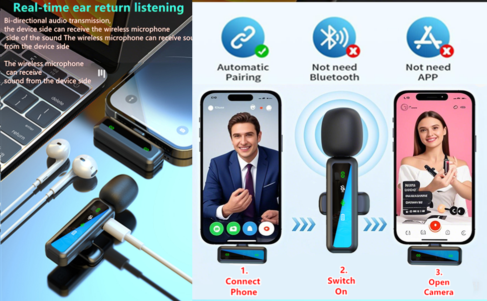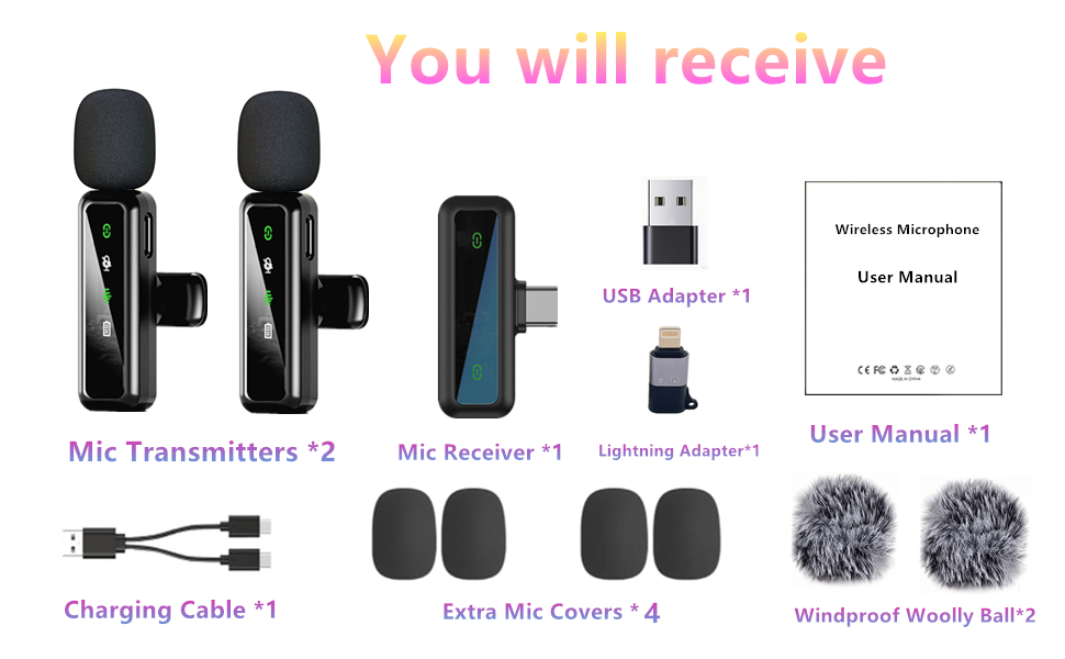 【Noise Reduction small Microphone】: The upgraded wireless clip-on microphone is equipped with a Lighting connector and a USB-C. Compatible with both iPhone iOS and Android smartphones and tablets, and Windows and Mac computers, (Note: Please turn on the "OTG" function of your USB C device before pairing)【mini mic Long Working Time and Rechargeable】A single lavalier microphone can work 6 hours when fully charged . It means you can use two microphones for up to 12 hours. You also can use the wireless microphone for Android iphone when charging your device—no need to worry about battery life.wireless mic【application scenario】 Mini microphone for iphone adopts a unique lapel clip detachable design, the microphone can be switched left and right to wear position, lapel microphones are compatible with iPhone15/ iPhone16 series, android phones, and also compatible with iPad air 5, laptops, microphone can be used for podcasting, video blogging, teaching interviews, online meetings, live streaming, as well as social media platforms such as YouTube and TikTok,lavalier microphone wireless,clip on microphone wireless,tiny microphone,clip on microphone,wireless microphone for iphone【Warmly tips wireless mic】2*Wireless Lavalier Microphone,1*Mic Receiver,1* USB C Charging Cable,1* Lightning Adapter, 1* Microphone User Manual,1*USB-A Adaptor,2*Windproof Hairball,4*Sponge Head, Please read the user manual and charge the wireless lavalier mic before using it for the first time. if you have any questions about our lapel microphone, Please feel free to contact us