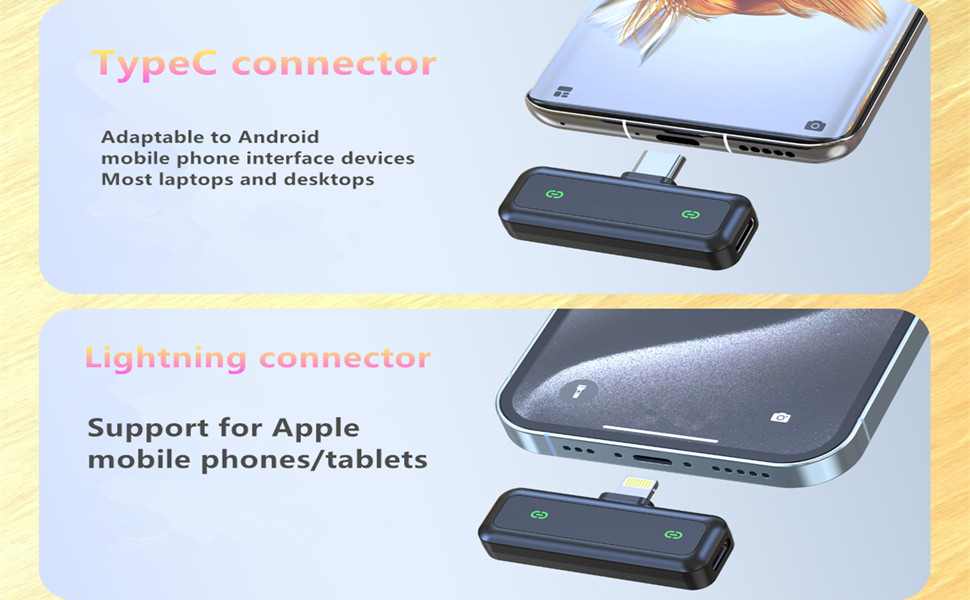 【Noise Reduction small Microphone】: The upgraded wireless clip-on microphone is equipped with a Lighting connector and a USB-C. Compatible with both iPhone iOS and Android smartphones and tablets, and Windows and Mac computers, (Note: Please turn on the "OTG" function of your USB C device before pairing)【mini mic Long Working Time and Rechargeable】A single lavalier microphone can work 6 hours when fully charged . It means you can use two microphones for up to 12 hours. You also can use the wireless microphone for Android iphone when charging your device—no need to worry about battery life.wireless mic【application scenario】 Mini microphone for iphone adopts a unique lapel clip detachable design, the microphone can be switched left and right to wear position, lapel microphones are compatible with iPhone15/ iPhone16 series, android phones, and also compatible with iPad air 5, laptops, microphone can be used for podcasting, video blogging, teaching interviews, online meetings, live streaming, as well as social media platforms such as YouTube and TikTok,lavalier microphone wireless,clip on microphone wireless,tiny microphone,clip on microphone,wireless microphone for iphone【Warmly tips wireless mic】2*Wireless Lavalier Microphone,1*Mic Receiver,1* USB C Charging Cable,1* Lightning Adapter, 1* Microphone User Manual,1*USB-A Adaptor,2*Windproof Hairball,4*Sponge Head, Please read the user manual and charge the wireless lavalier mic before using it for the first time. if you have any questions about our lapel microphone, Please feel free to contact us